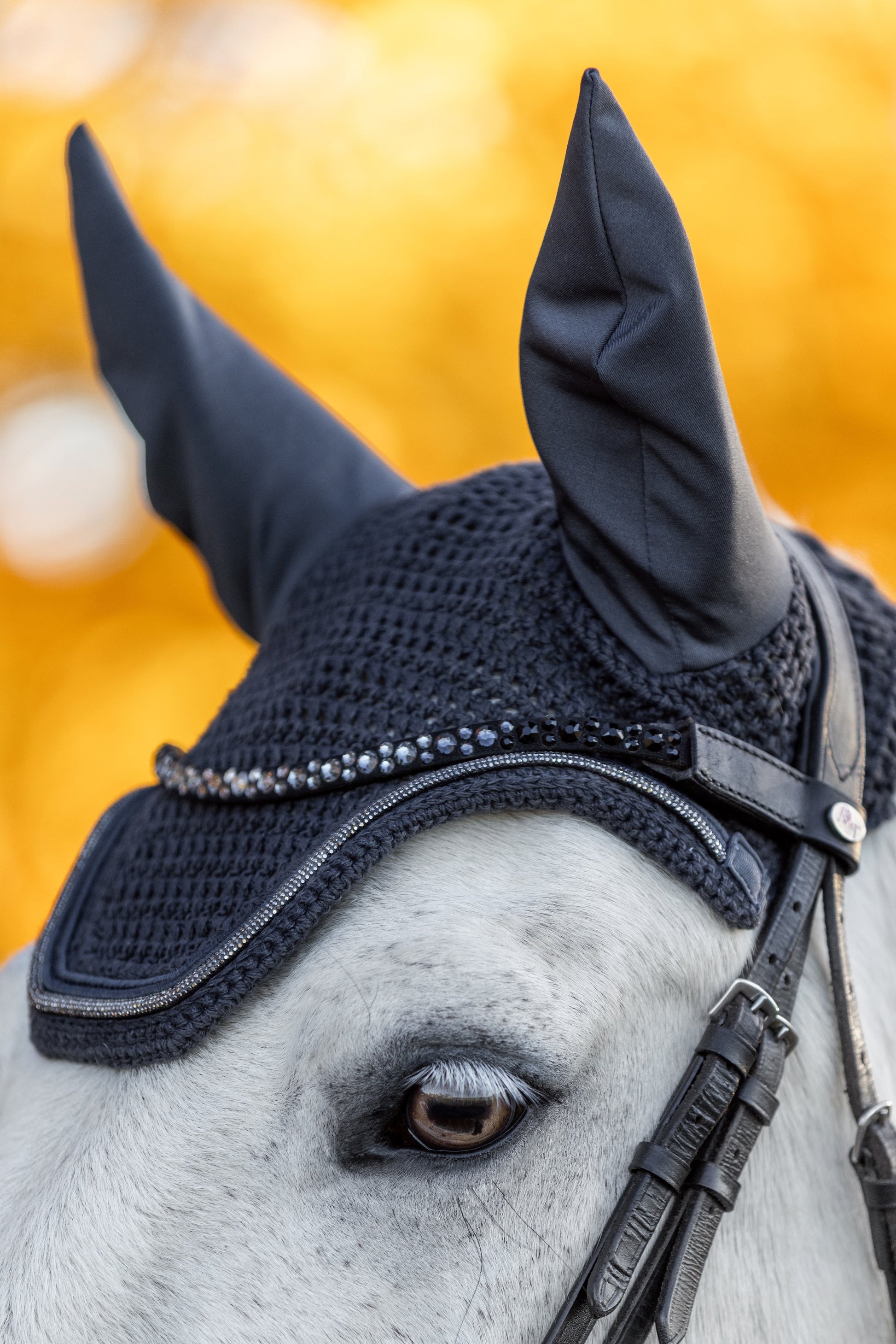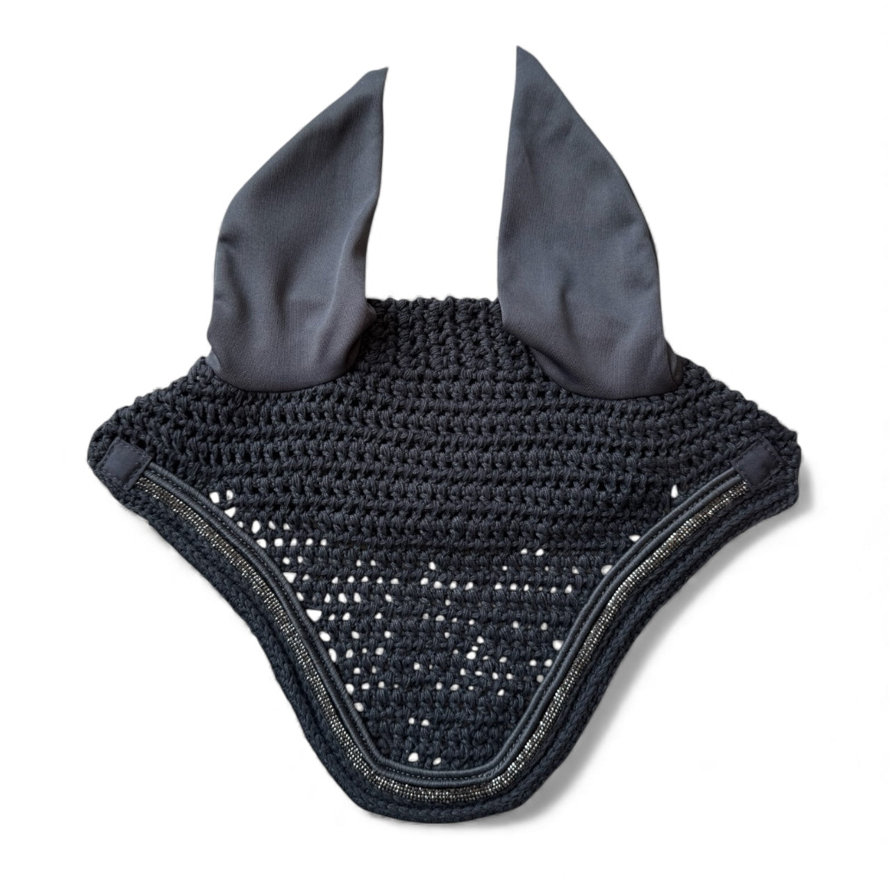 Unsere handgestrickte Fliegenmütze Glowshell ist die perfekte Ergänzung zu unserer eleganten Schabracke mit Glitzerkordel. Die elastischen Ohren bieten zuverlässigen Schutz vor Insekten und sind anatomisch geformt, um deinem Pferd höchsten Komfort zu bieten. Das verlängerte Genickstück verhindert ein Verrutschen und sorgt für optimalen Halt.